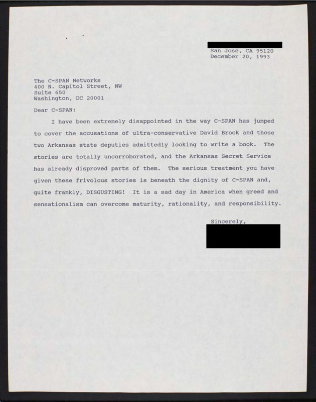 Expresses discontent with appearance of David Brock on program and his comments about Clinton.