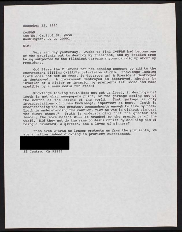 Letter to C-SPAN, 1993-12-22; 92243