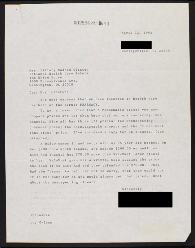Letter to C-SPAN, 1993-04-22; 25239
