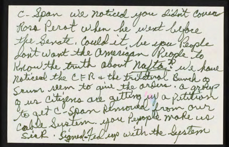 Expresses discontent with C-SPAN for not broadcasting Ross Perot's speech at the Senate regarding NAFTA.