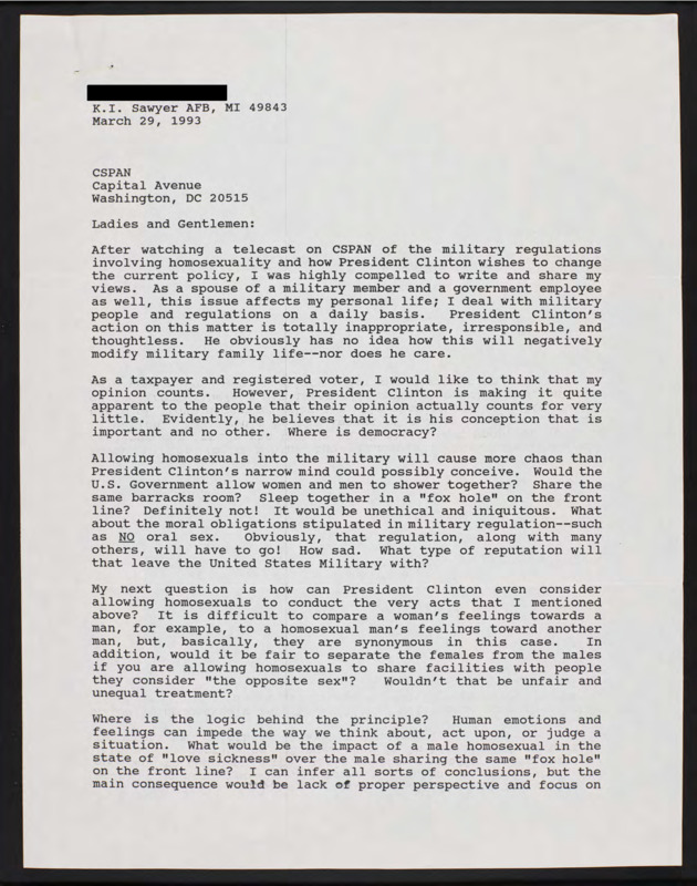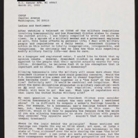 Discusses issue of allowing gay people into the military and why Clinton is wrong for doing so.