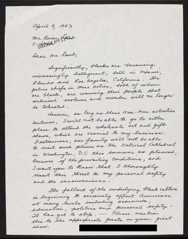 Expresses discontent with the "black culture" of violence in Miami and Los Angeles, says she can't go to the National Cathedral anymore because of black gang violence.