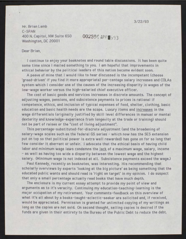 Letter to C-SPAN, 1993-03-22; 93555