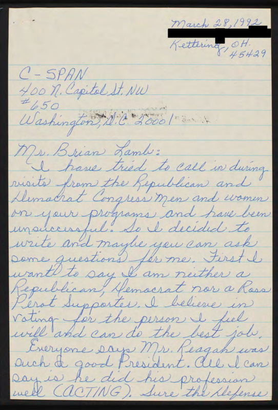 Letter to C-SPAN, 1992-03-28; 45429