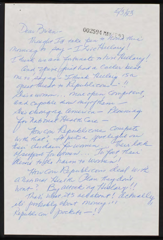 Attaches letters discussing several things, including: Hillary Clinton and why Republicans hate her so much, Republican/conservative telephone lines, conservative racism, lawyers, etc.