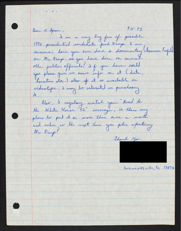 Asks if the network has created an American Profile about Jack Kemp and asks for the Road to the White House be aired multiple times.