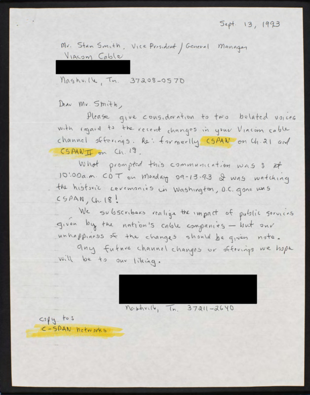 Expresses being unhappy with their cable company switching the C-SPAN network channel.