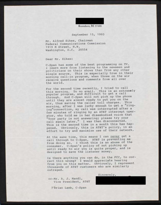 Complains about AT&T's policy of disconnecting calls after long waiting periods because it means they cannot call into the show.