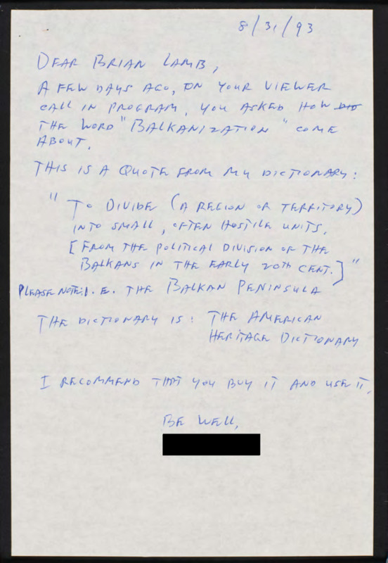 Recommends Brian Lamb consult a dictionary in response to an inquiry about "Balkanization."