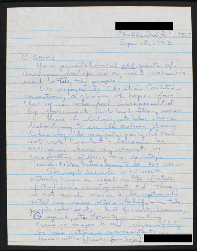 Explains how they enjoyed the program about the Christian Coalition and how they do not respect the President. Believes there is not much to be optimistic about for the U.S.'s future and that crime is rampant.