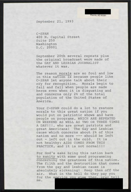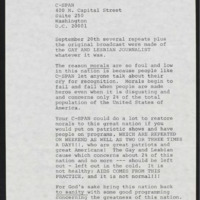 Alleges C-SPAN contributed to the low morality in America by televising a gay/lesbian journalist. Claims AIDS comes from gay and lesbian people and that the community is destructive, and proposes instead airing "patriotic" programs.