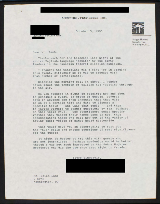 Thanks the network for televising the Canadian federal elections debate. Suggests a program with journalists discussing one topic and viewers faxing questions relating to the topic.