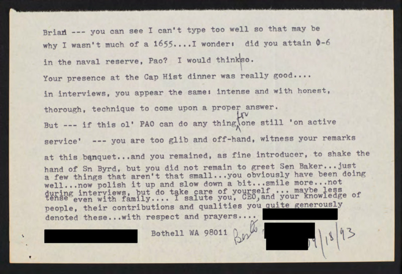 Discusses a banquet Brian Lamb appeared at. Praises Lamb as an introducer and for being intense and honest. Recommends Lamb slow down and smile more.