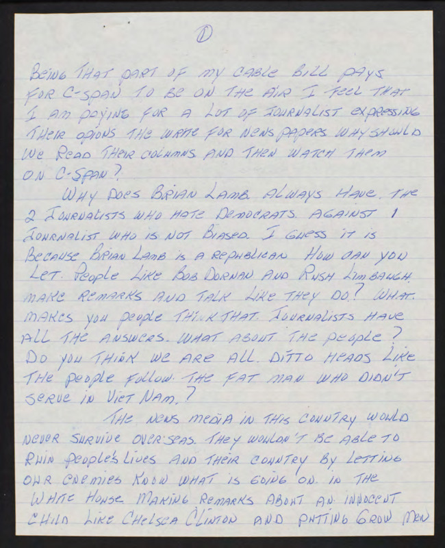 Assumes Brian Lamb is a Republican because the journalists invited hate Democrats. Claims the network is not fair and displays favoritism.