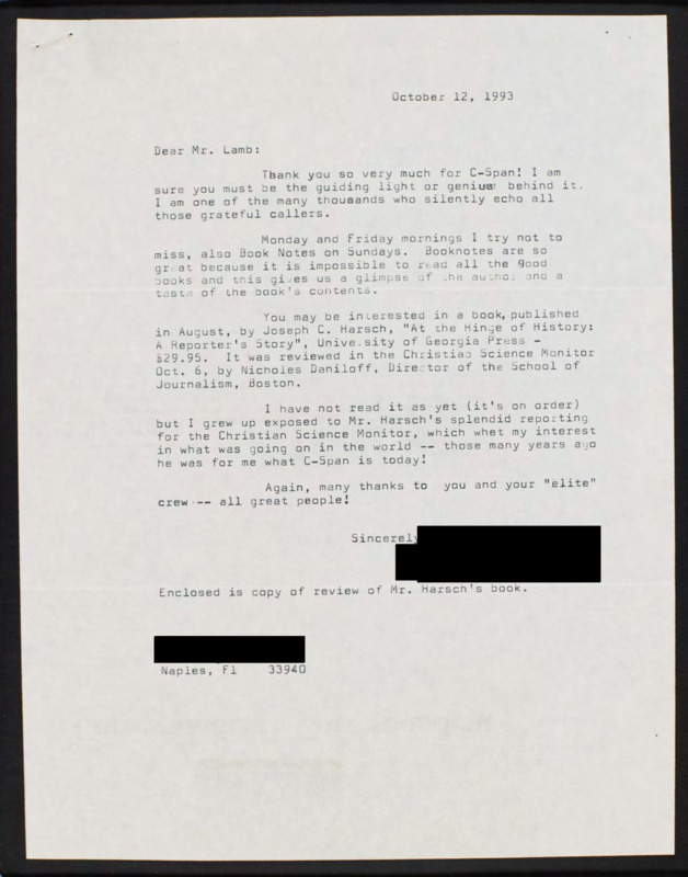 Recommends Joseph C. Harsch's book ,At the Hinge of History: A Reporter's Story, for Booknotes. Harsch is a reporter for the Christian Science Monitor.
