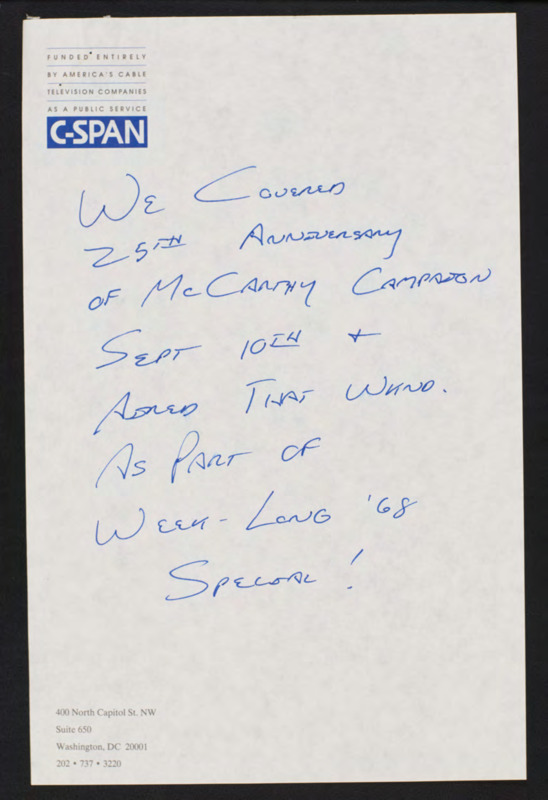 Argues that Minnesota Senator Eugene J. McCarthy was an important figure in 1968 and should have been included in a program. Attached is information about the "New Democrats" ideas on how to create jobs.