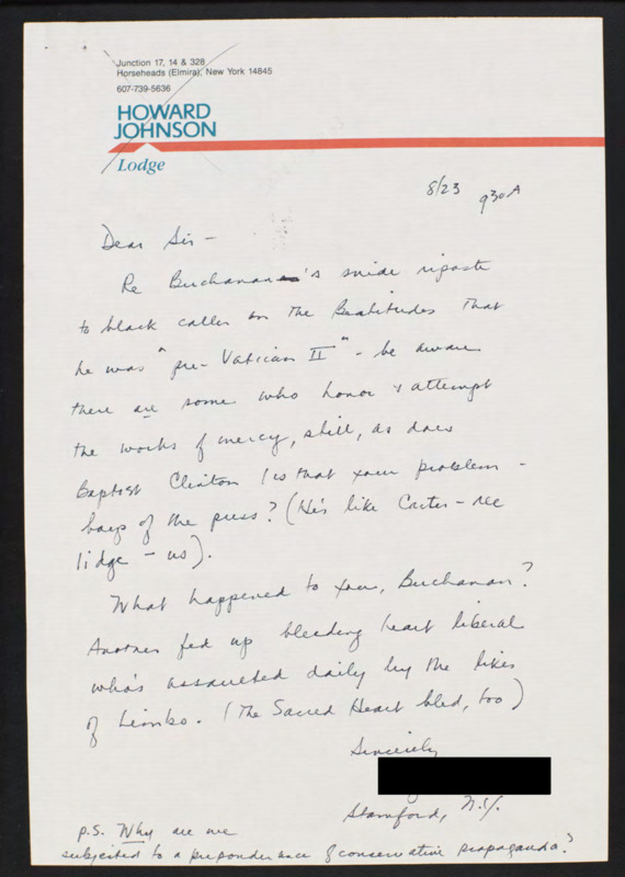 Address Pat Buchanan's comments on religion and alleges there is a preponderance of Republican propaganda.
