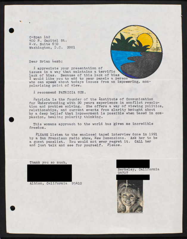 Recommends Patricia Sun to be invited as a guest panelist. Attached is a audiocassette tape of Patricia Sun on a radio show.