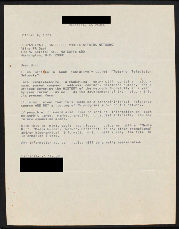 Explains their idea to create a reference book with the contact information and history of networks. Requests from C-SPAN information about the network.