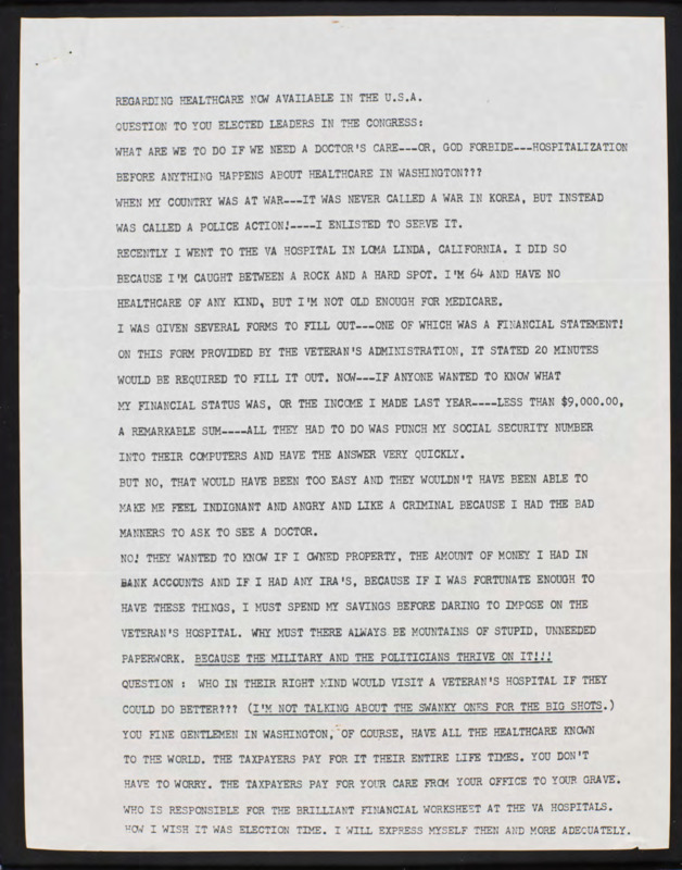 Explains how they served during the war in Korea and do not have health care. Describes their experiences with health care being inaccessible because of financial and bureaucratic barriers.