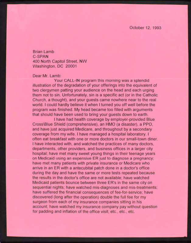 Complains about the guests during a call-in show discussing health care. Disagrees with Clinton's health care plan and recommends a single-payer plan.