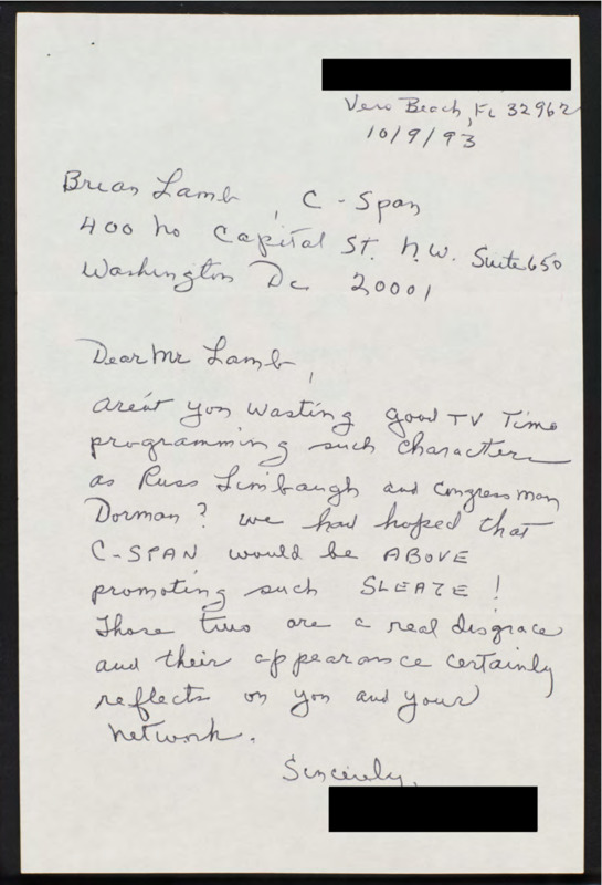 Refers to Robert Dornan and Rush Limbaugh as "sleaze" and says choosing to televise the two reflects poorly on the network.