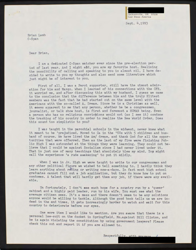Says they used to support Ross Perot and believes that the country is in the "end times." Attached are newsletters arguing that taxation is theft and that diet soda is dangerous.