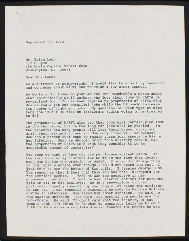 Asserts none of the pro-NAFTA journalists have read the treaty and that jobs will be lost. Mentions how they voted for George Bush in the past and why they will not be voting Republican in the future.