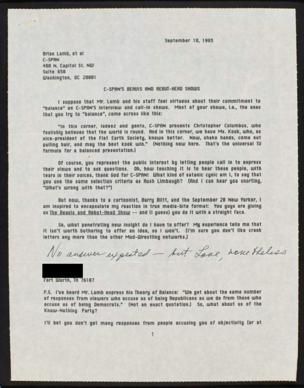 Disagrees with how "balance" is enacted on the network, compares Brian Lamb to Rush Limbaugh, and says the call-in system is broken.