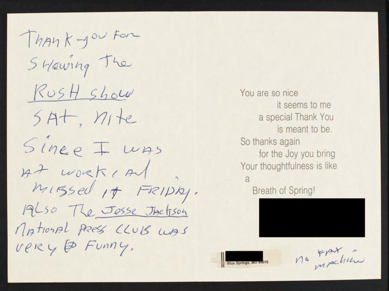 Thanks the network for showing the Rush Show and comments the Jesse Jackson National Press Club was funny.