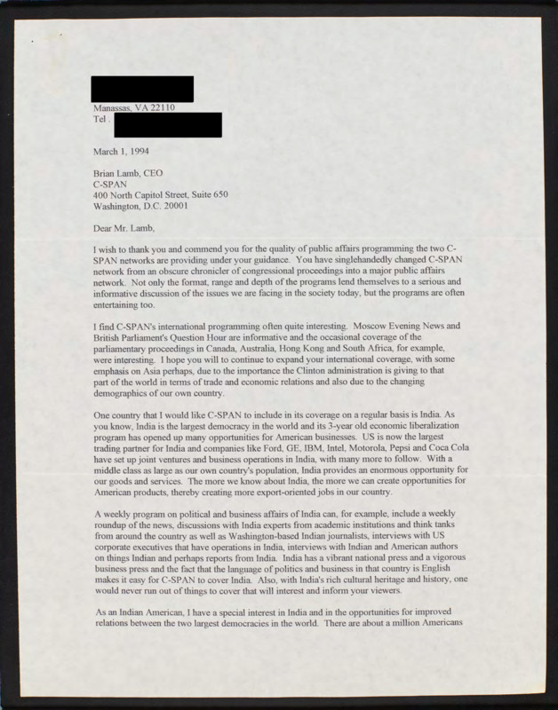 Thanks the network for televising foreign news like the Moscow Evening News and "Question Time." Suggests a program focusing on Indian news and business affairs.