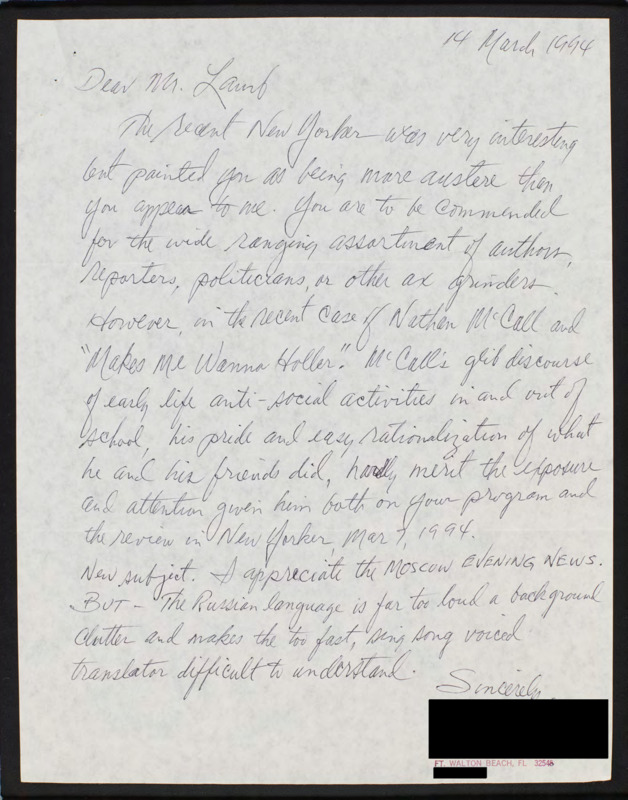 Letter to C-SPAN, 1994-03-14; 32548