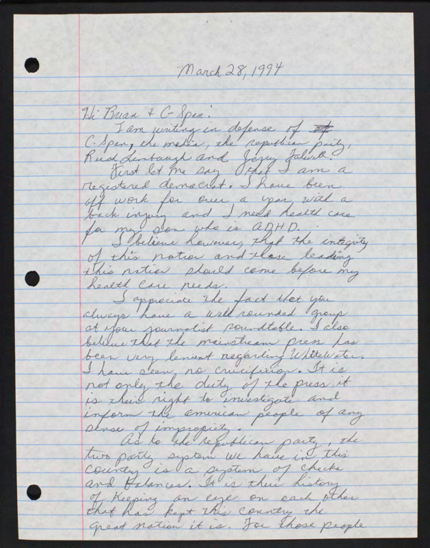 Explains they are putting the needs of the nation before their medical needs. Says the White House press are lenient and should be investigative. Expresses support for Rush Limbaugh and mentions a video tape about Whitewater & Clinton corruption.