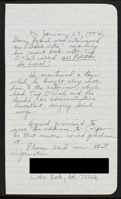 Requests the information on how to purchase a tape that was discussed by a guest on Booknotes.