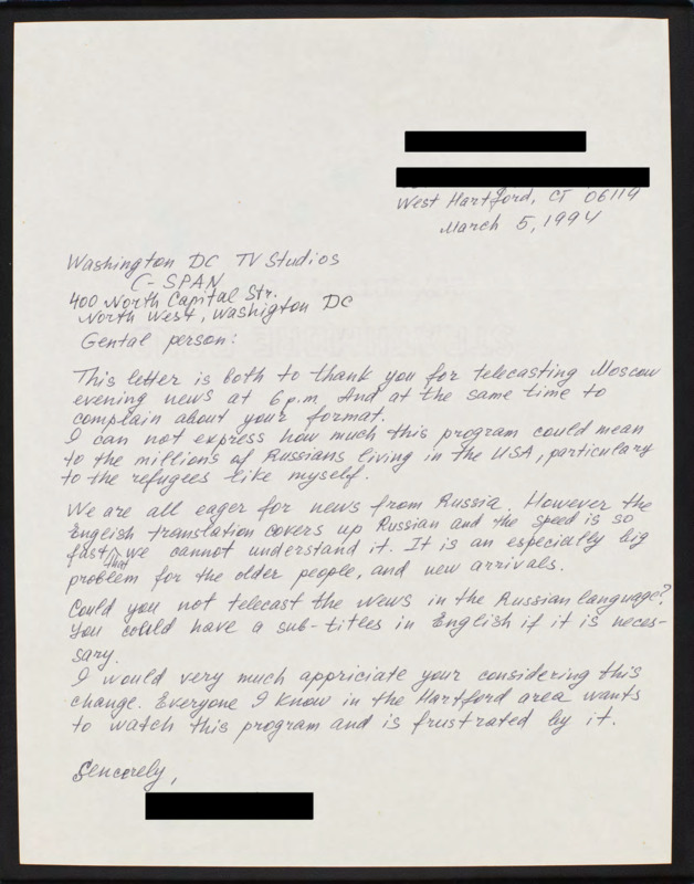 Thanks the network for televising the Moscow Evening News but complains about the format. Suggests televising the news in the original language and using English subtitles.