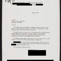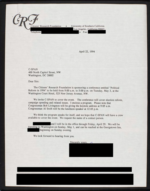 Invites the network to televise the "Political Reform in 1994" conference sponsored by the Citizen's Research Foundation. Attached is a program schedule for the conference.