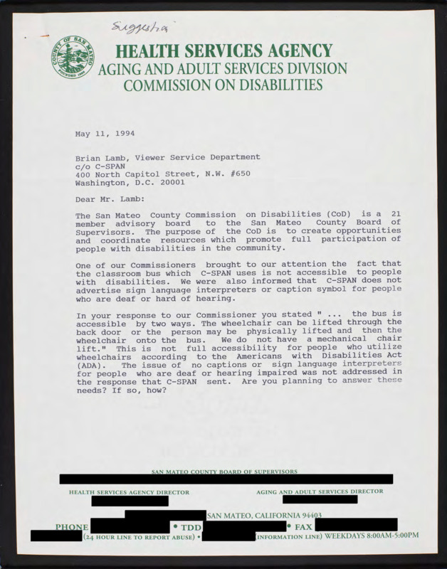 Explains the C-SPAN Bus does not comply with the Americans with Disabilities Act and hopes the issues will be fixed to include accessibility.