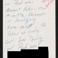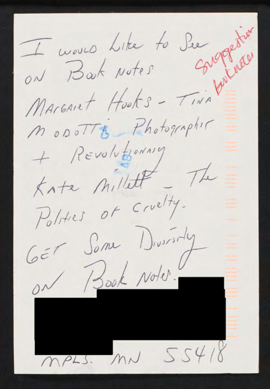 Tells the network to include diversity on the Booknotes program and recommends Margaret Hooks and Kate Millett, among others.