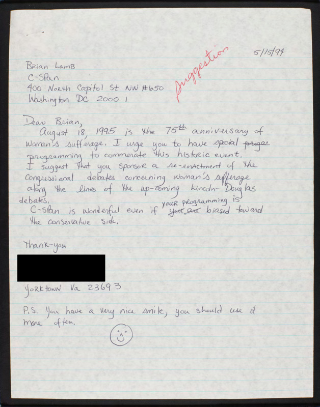 Urges the network to televise a program dedicated to 75th anniversary of women's suffrage.