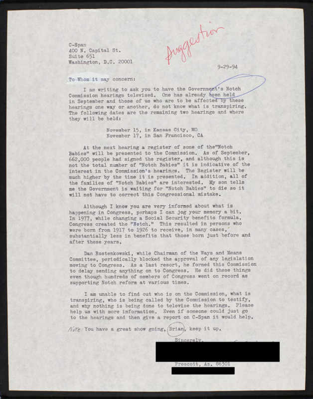 Suggests televising the Notch Commission hearings. Says they are asking because they want to know who is on the commission and what was transpired.