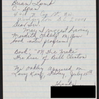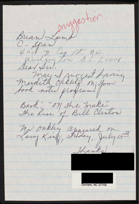 Suggests Meredith Oakley's book On the Make: The Rise of Bill Clinton for Booknotes.