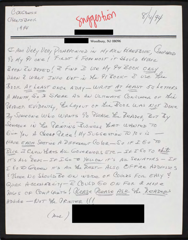 Expresses why they are disappointed in the 1994 Congressional Handbook and prefers the 1991 version. Says they write a lot of letters and would suggest color coding the sections to distinguish politicians.