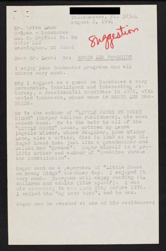 Recommends Roger Lea MacBride's book Little House on Rocky Ridge for Booknotes.