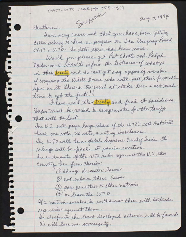 Requests Pat Choate and Ralph Nader to discuss the World Trade Organization and the General Agreement on Tariffs and Trade.