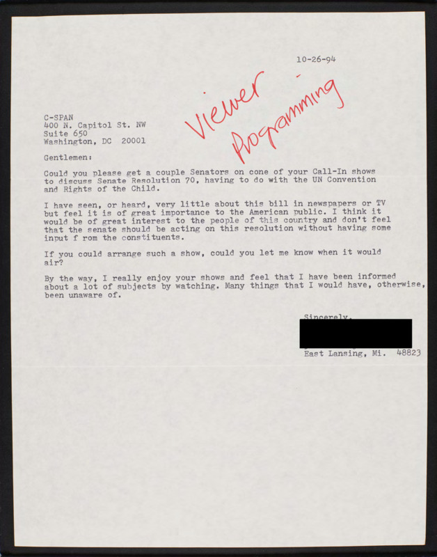 Letter to C-SPAN, 1994-10-26; 48823