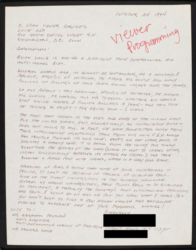 Claims Brian Lamb has anti-Israel bias and should hire qualified Jewish moderators.
