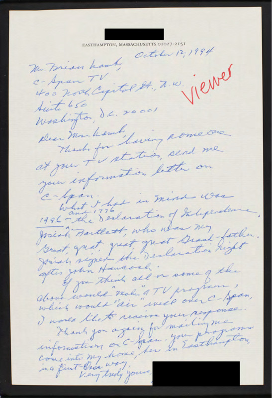 Suggests a program about the Declaration of Independence because their ancestor, Josiah Bartlett, signed it.