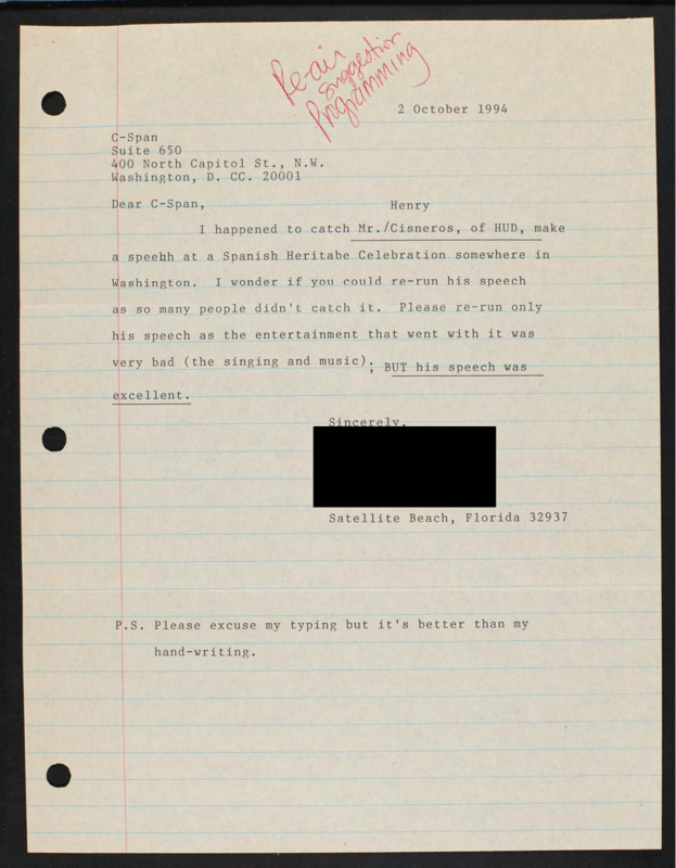 Asks if the network would re-run Mr. Cisnero's speech at the Spanish Heritage Celebration.