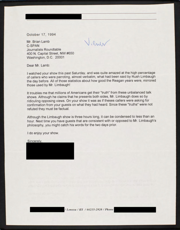 Expresses concerns that viewers repeat the words of Rush Limbaugh and believes Limbaugh ridicules opposing views.
