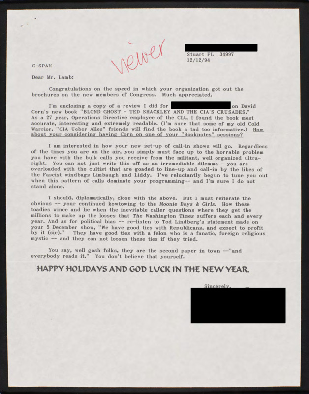 Requests David Corn's book Blond Ghost: Ted Shackley and the CIA's Crusades for Booknotes, expresses interest in new setup for call-in shows, and accuses C-SPAN of bias.